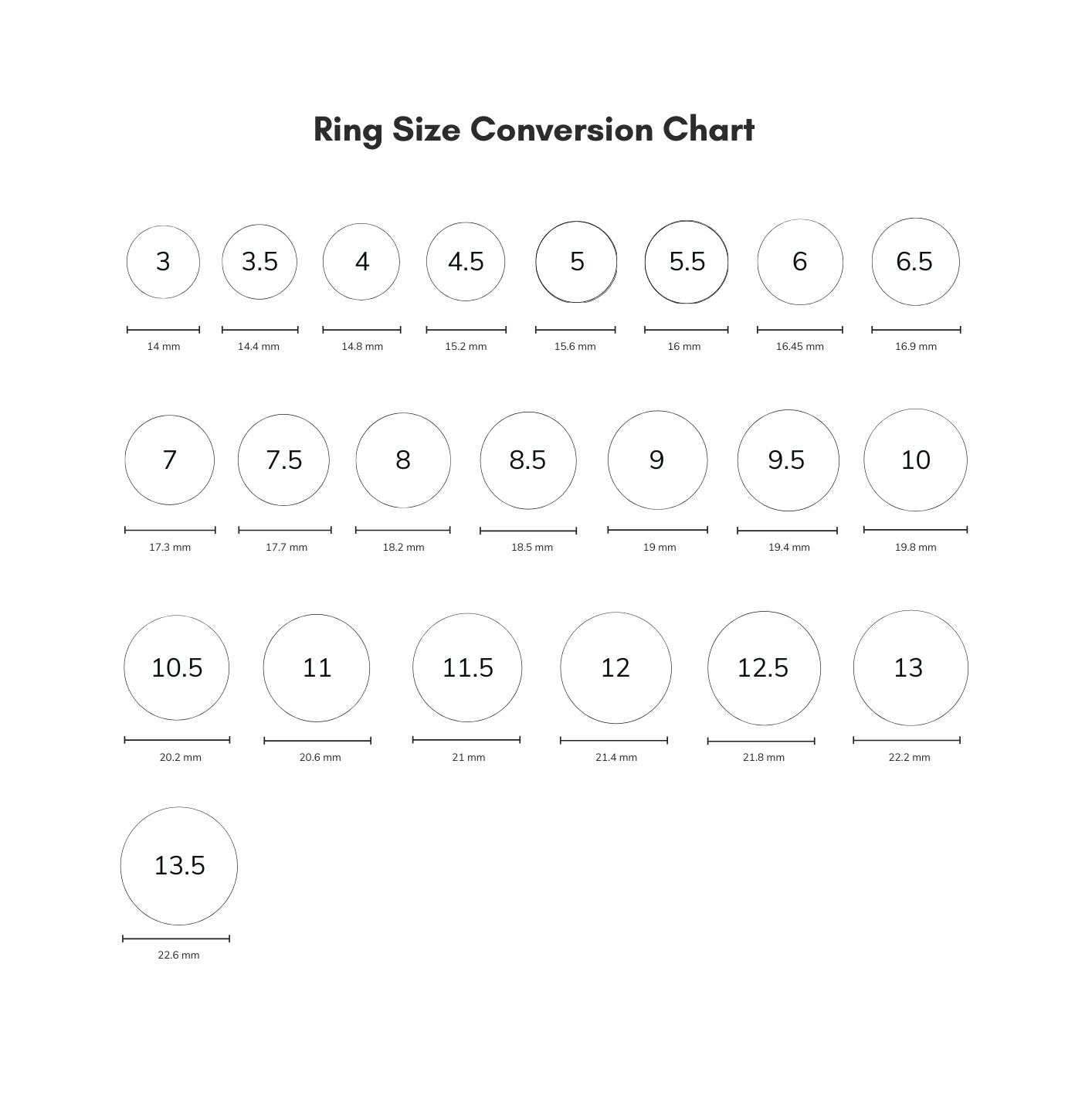 All our rings are made in standard US sizes. Use the chart below to see how US sizes correspond to finger circumference and convert to international sizes. The same sizing format applies to engagement rings, wedding bands, and fashion rings