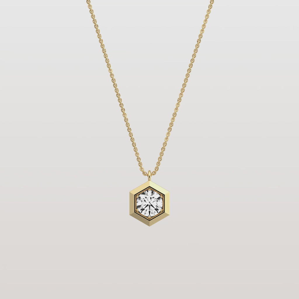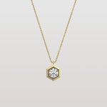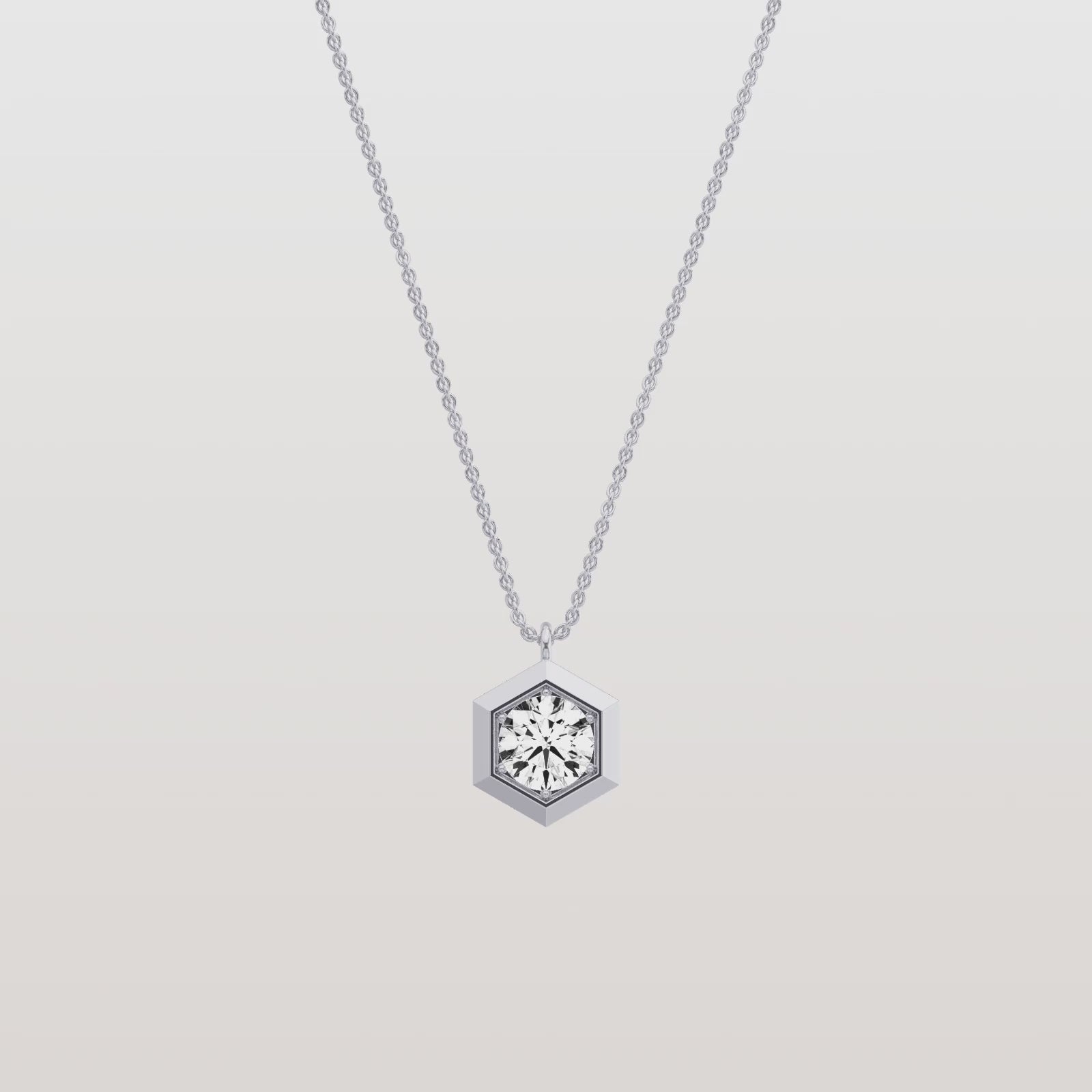 This necklace features a round diamond in a hexagon-shaped bezel setting. It is the unique version of necklace.