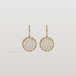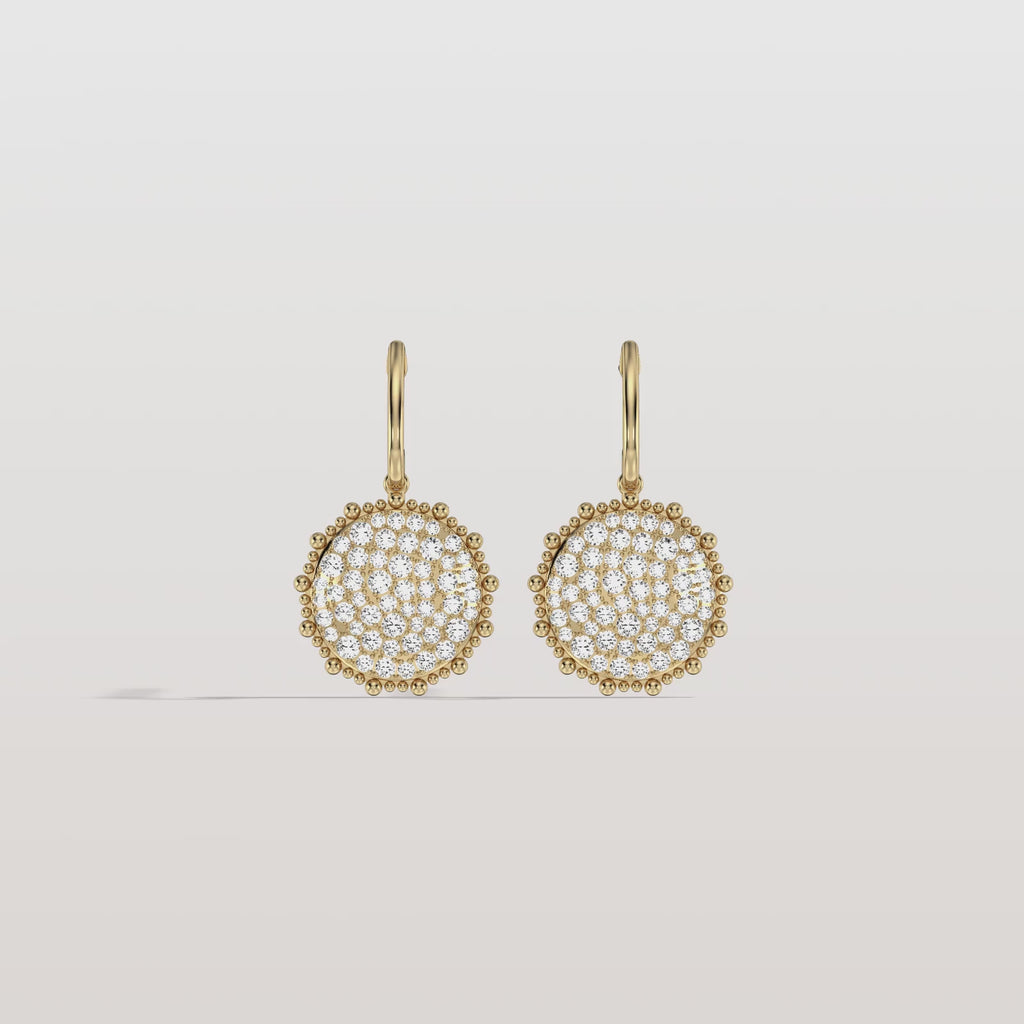 Lab diamond disc drop earrings in 18k yellow gold. An artistic mlange of brilliant cut diamonds are pave set in a disc with a beaded border for that unexpected detail. A gorgeous piece on its own or a perfect layering style to add elegance to any ear combo.
