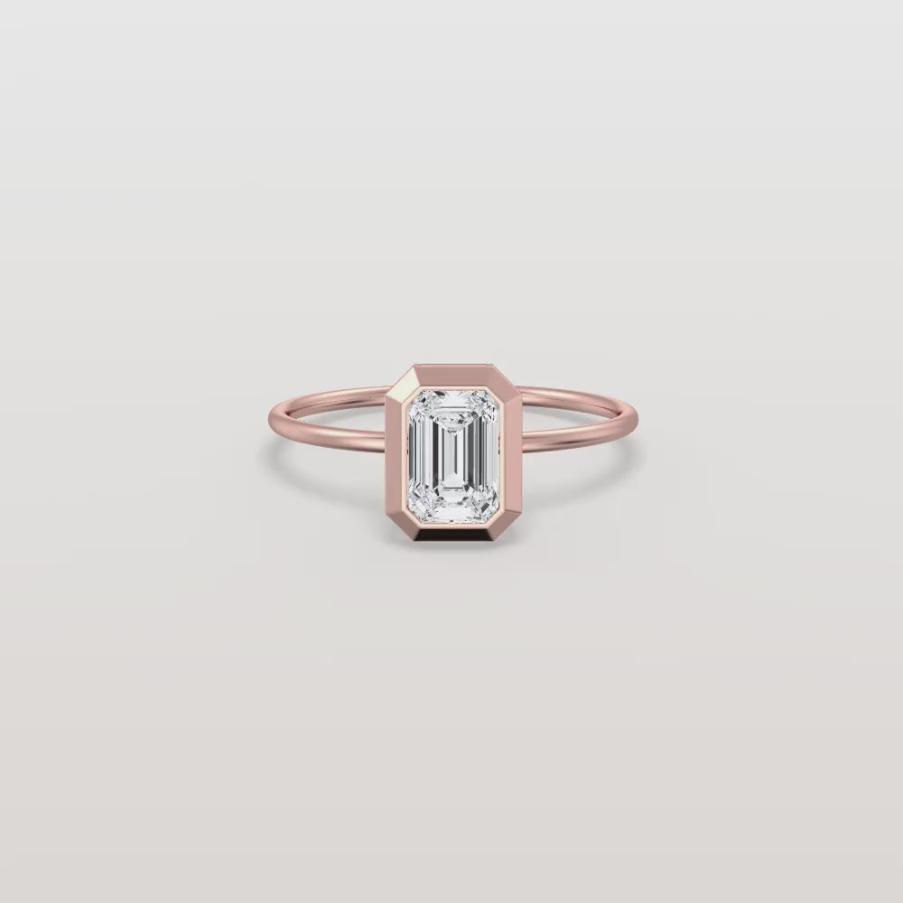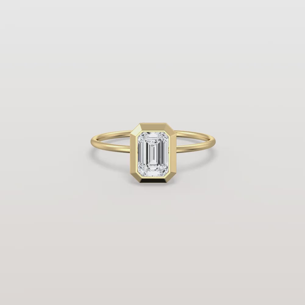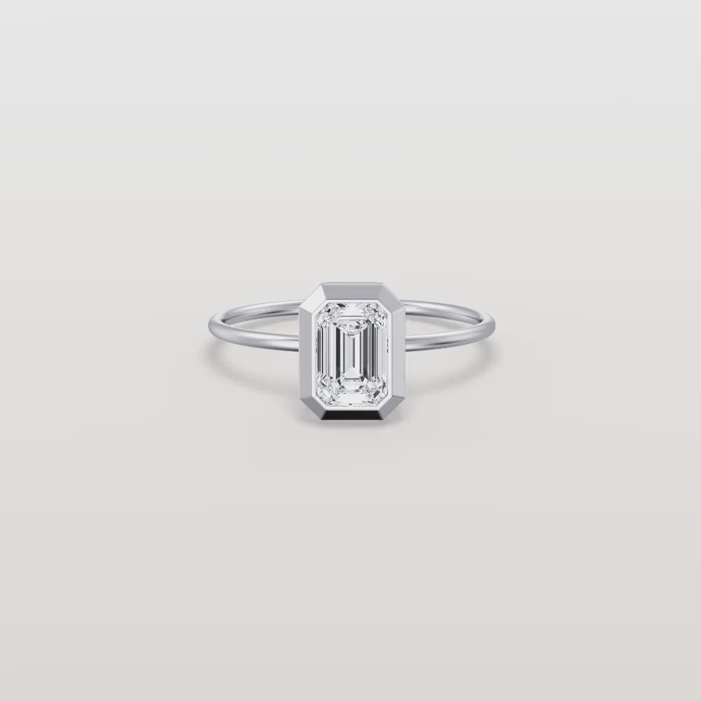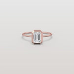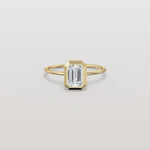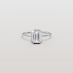 This ring features a striking emerald-cut lab diamond set in a metal band. The design reflects modern Art Deco style, emphasizing clean lines and symmetry, making it an elegant and sophisticated choice for a statement ring or engagement ring.