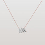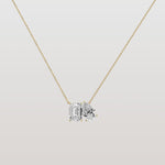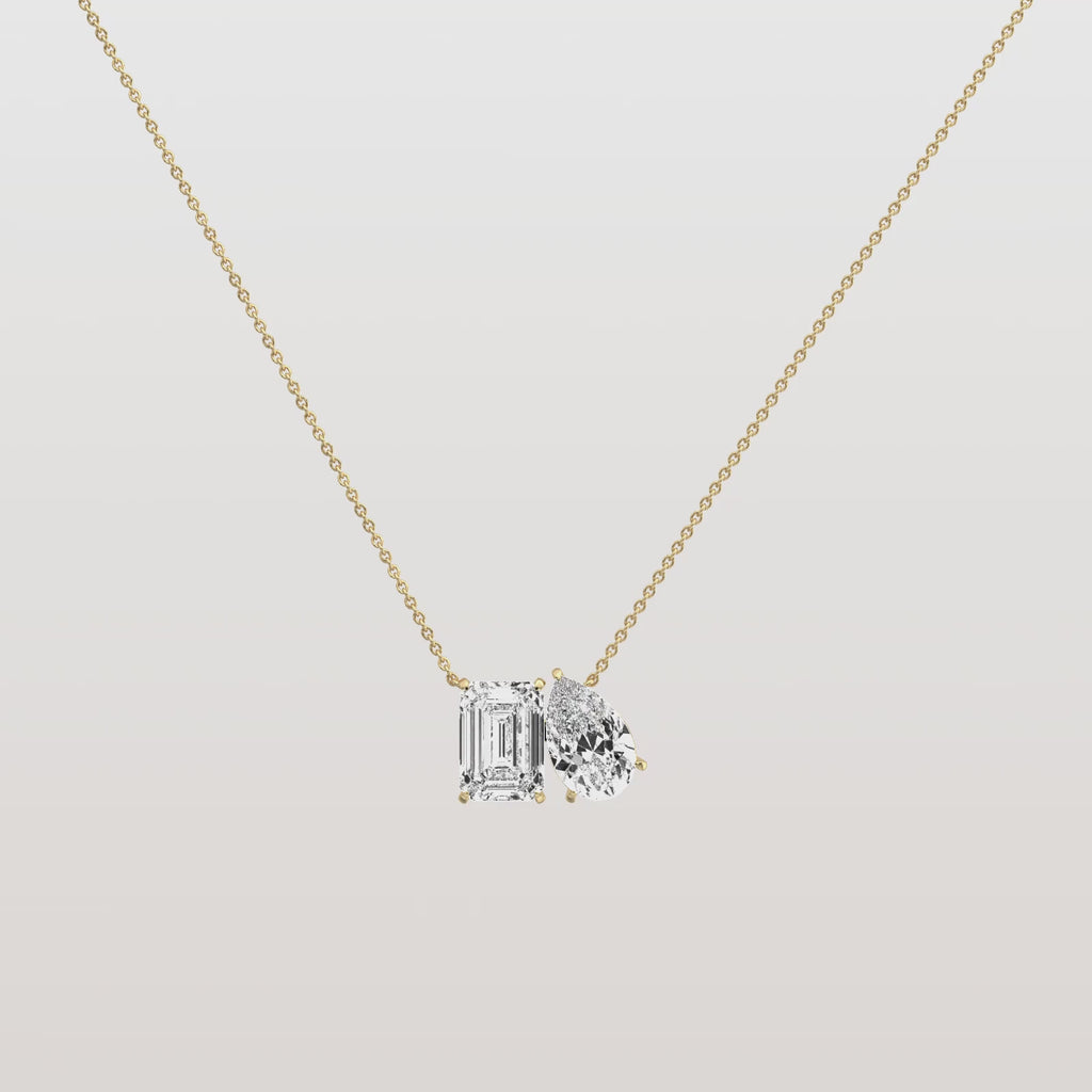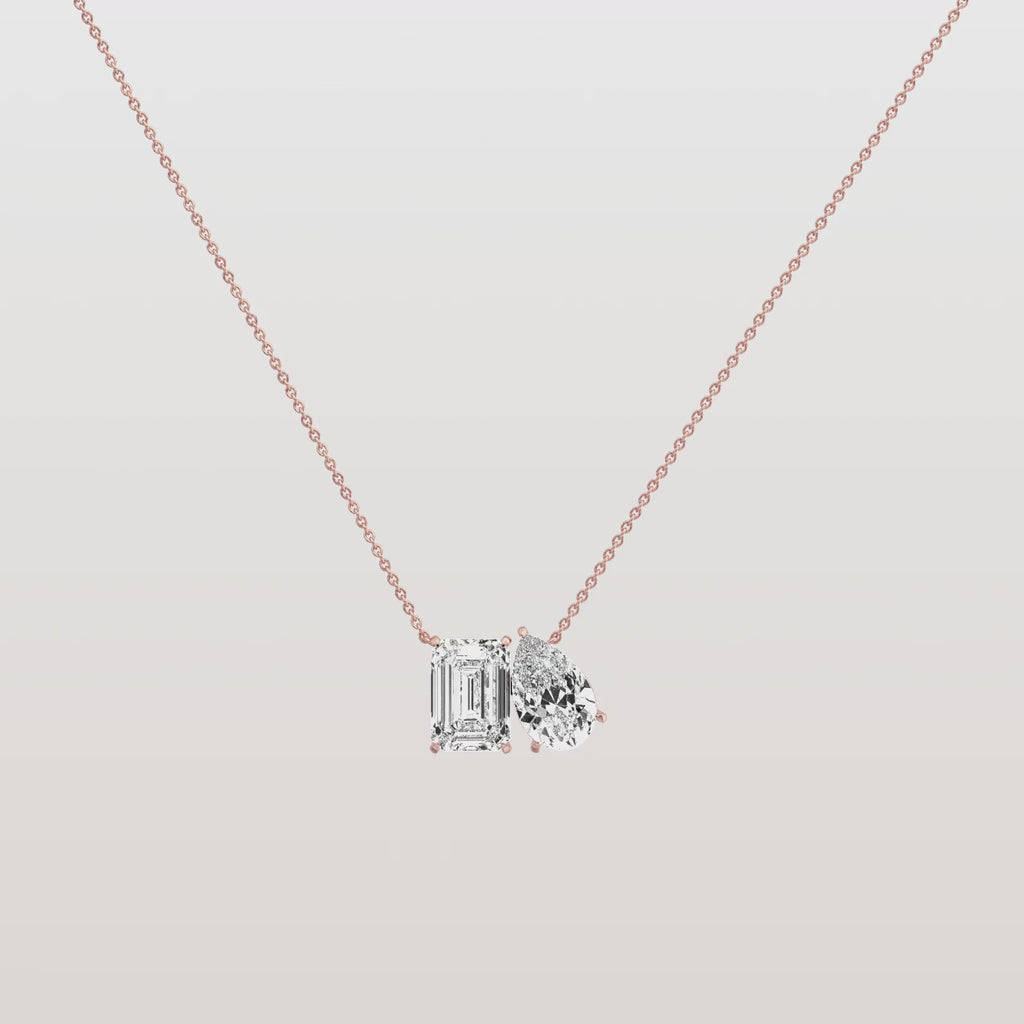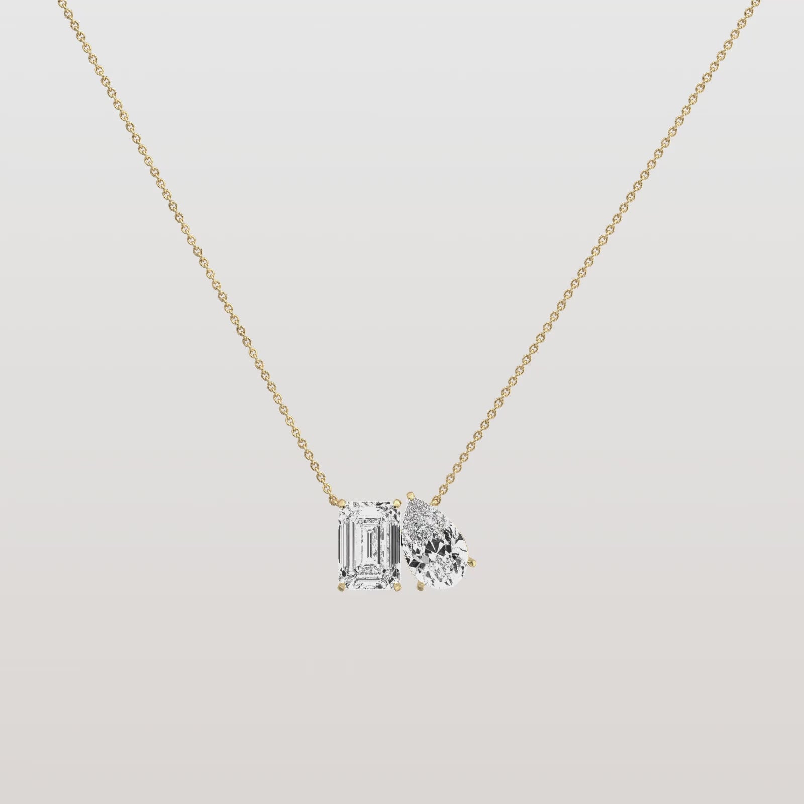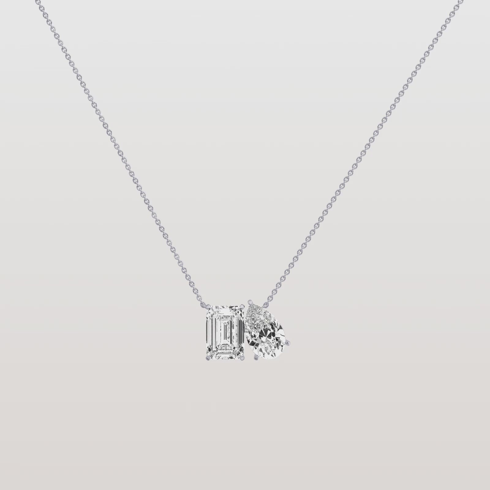 The emerald-cut diamond, with its step-cut facets and pear-cut diamond's graceful curves, creates a captivating core that adds a touch of uniqueness to this two stone necklace. Crafted with love, the diamonds are securely held in a prong setting. The design of this Toi et Moi necklace transcends trends, making it a timeless piece that you can cherish for generations to come.