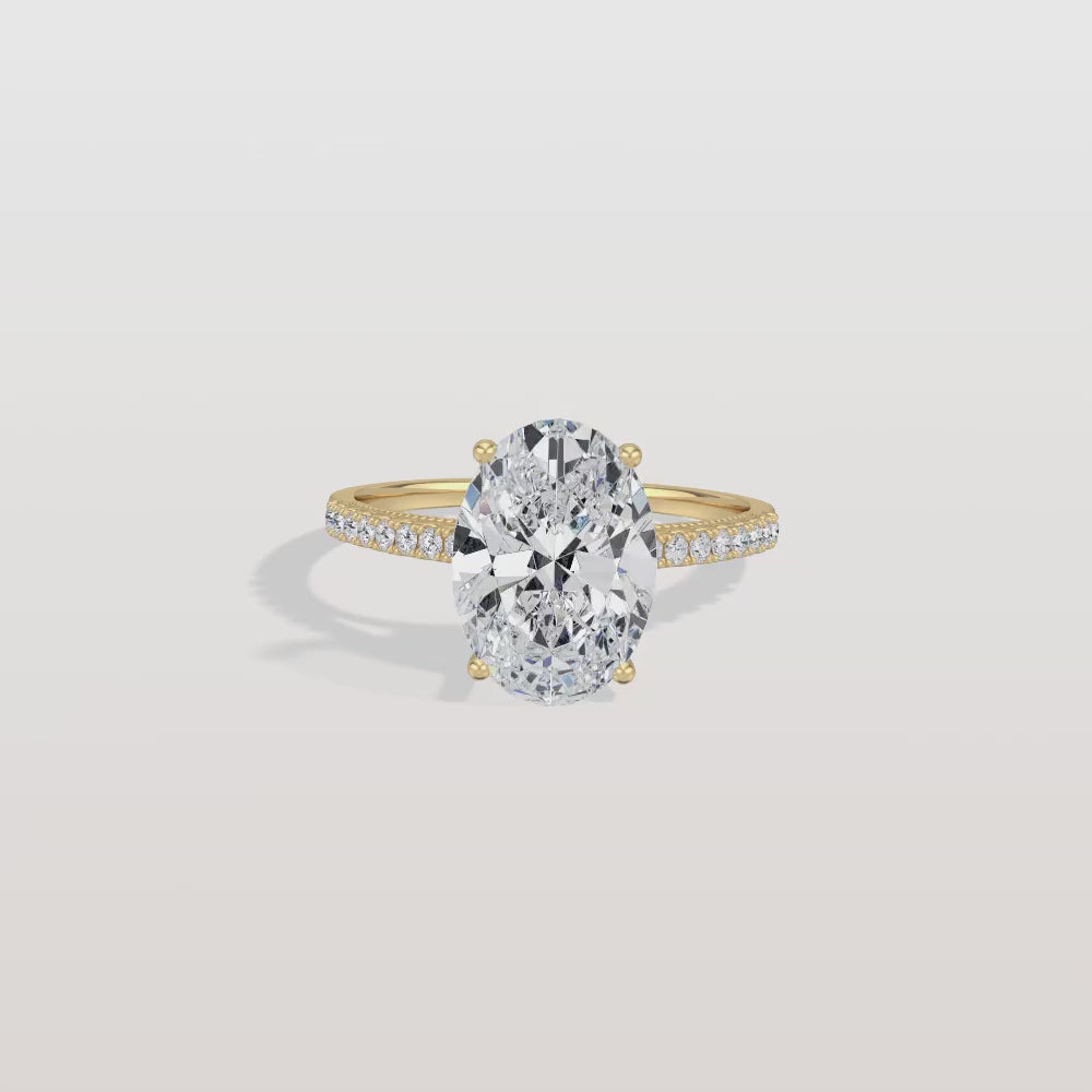 This exquisite engagement ring showcases an oval cut lab grown diamond, cradled by a cathedral setting and flanked by a shimmering pave band,designed to maximize brilliance and modern charm.