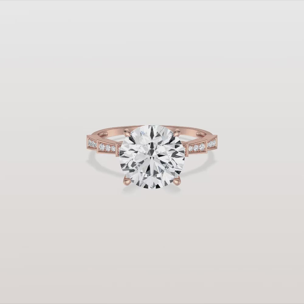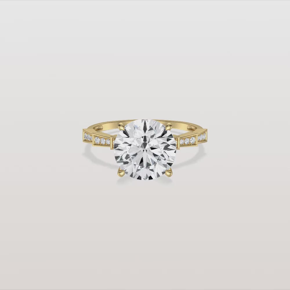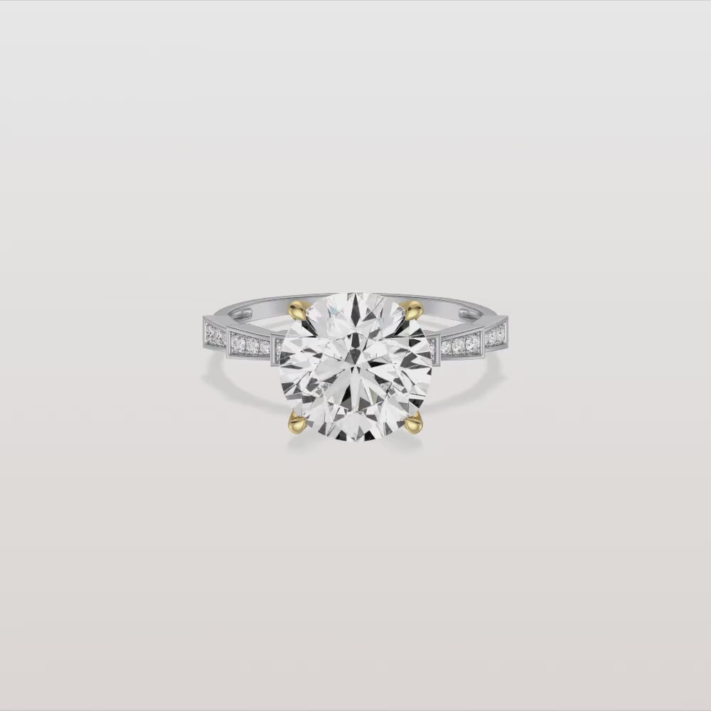 A bold yet refined solitaire fashion ring featuring a geometric pavé band in 14k gold and platinum. The segmented square settings add architectural elegance to the classic round center diamond.