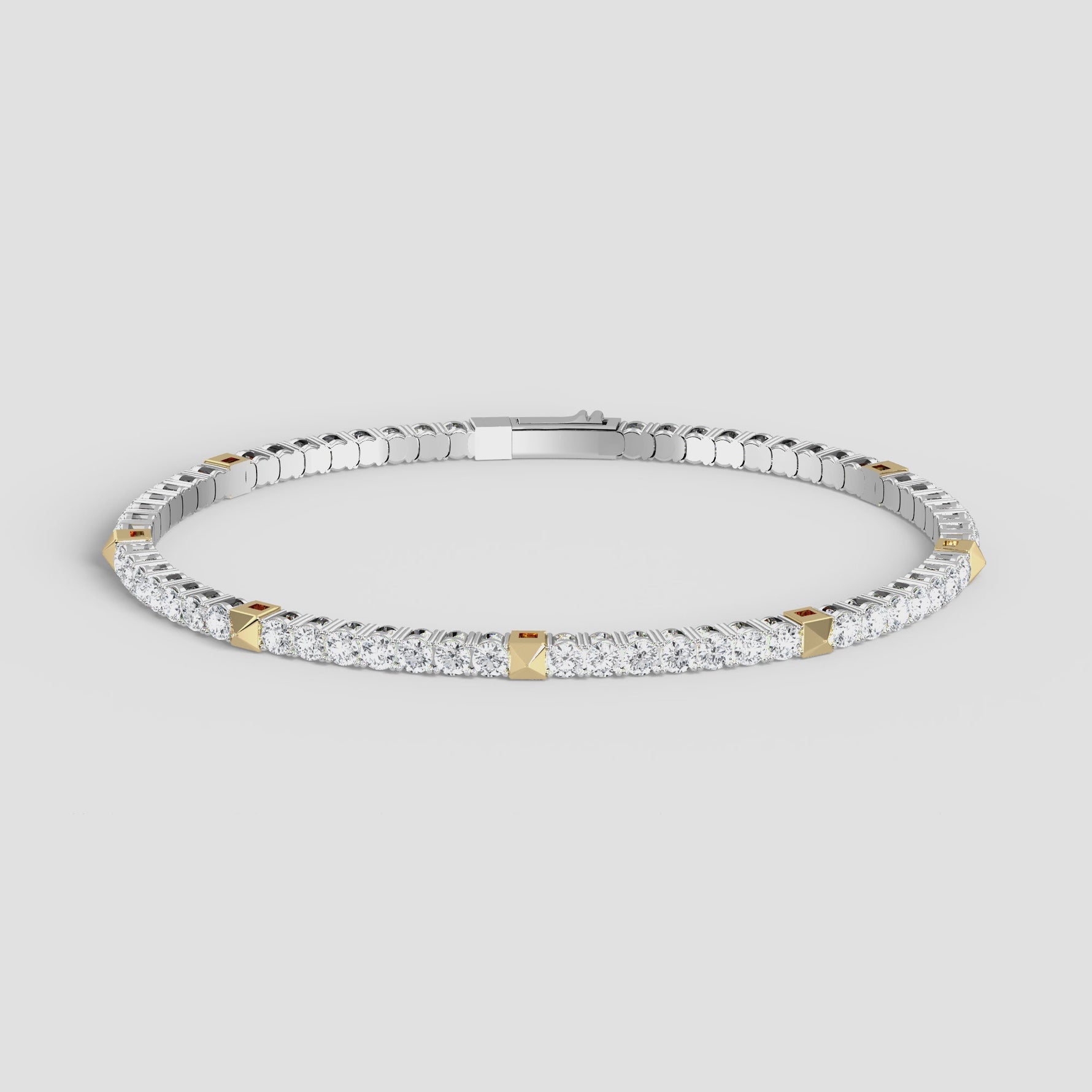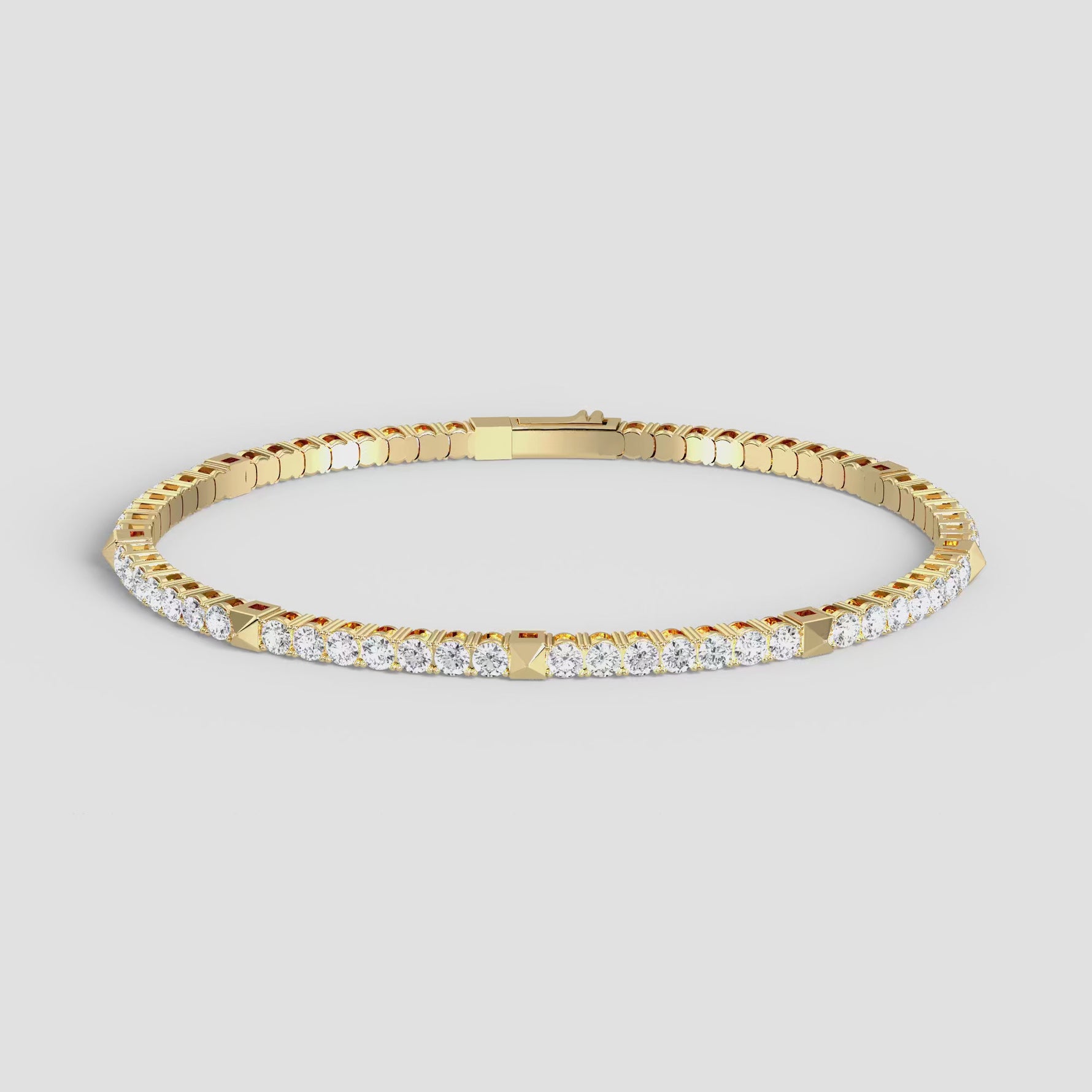 Unit price perCrafted from 925 sterling silver and set with 4.3 carats of sparkling moissanite, this tennis bracelet redefines elegance and convenience. Designed with a special flexible structure, it combines the fluidity of a tennis chain with the easy wearability of a bangle — solving the classic struggle of self-wearing a tennis bracelet. A pyramid-shaped metal element is interspersed between each of the seven moissanite stones, creating a rhythm of light and shadow, adding a unique artistic touch and layered brilliance to the bracelet.