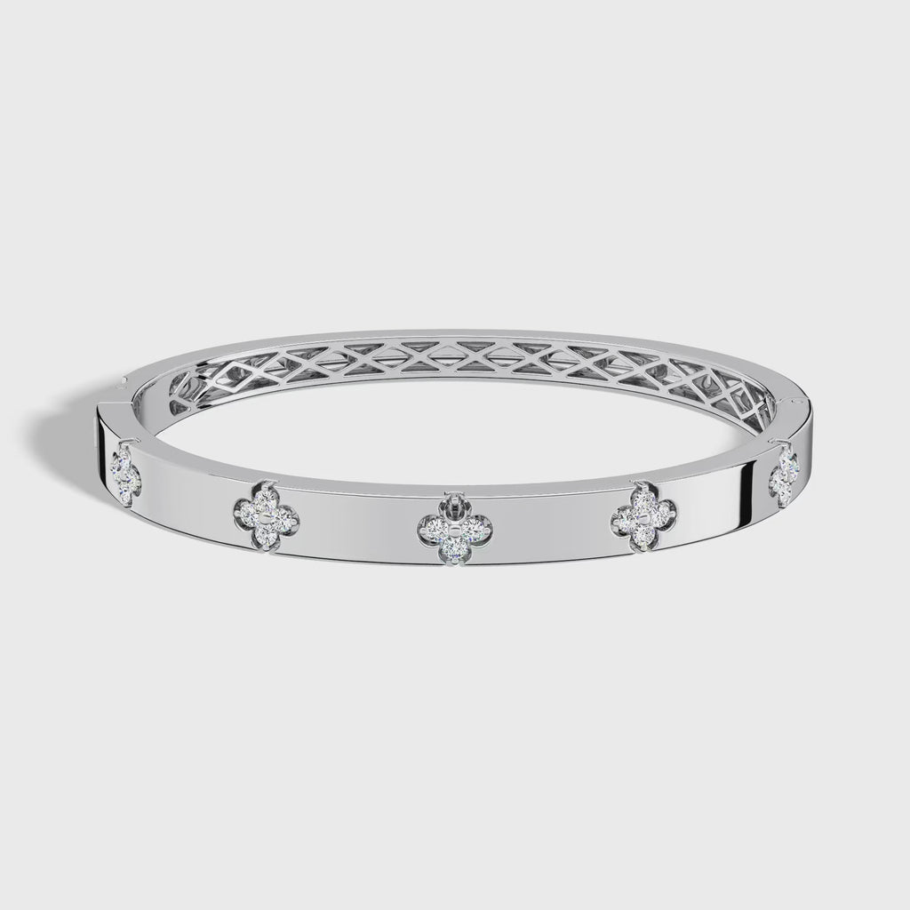Unit price perThis Charm & Dazzle four-leaf clover hinged lab made diamond bangle perfectly blends elegance and strength. Crafted from substantial 14k gold with a polished finish, the bracelet features 20 D color,VVS clarity brilliant round lab-grown diamonds arranged in a pattern of five four-leaf clover flowers on the front, bringing you good fortune. The hinged design ensures a sturdy and comfortable fit, showcasing the timeless charm of modern luxury.