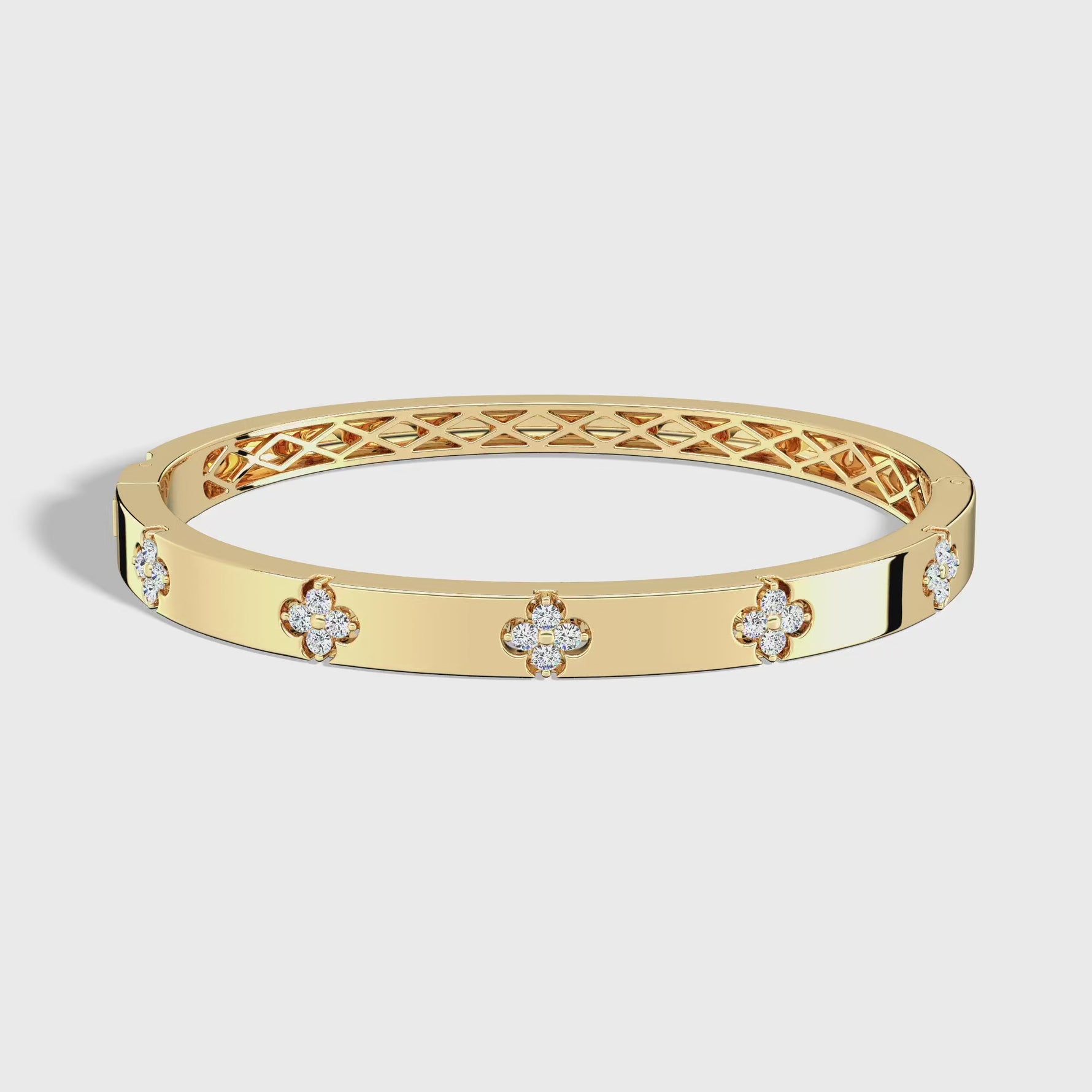Unit price perThis Charm & Dazzle four-leaf clover hinged lab made diamond bangle perfectly blends elegance and strength. Crafted from substantial 14k gold with a polished finish, the bracelet features 20 D color,VVS clarity brilliant round lab-grown diamonds arranged in a pattern of five four-leaf clover flowers on the front, bringing you good fortune. The hinged design ensures a sturdy and comfortable fit, showcasing the timeless charm of modern luxury.