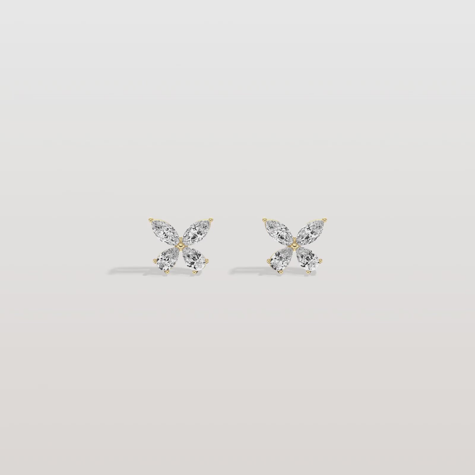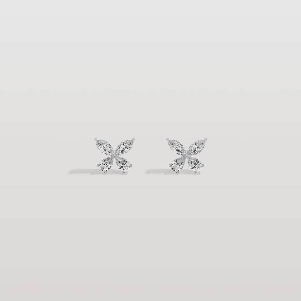This pair of earrings feature four marquise-shaped and four pear lab diamonds arranged in a delicate butterfly motif. The eight petals symbolize the balance of life, beauty, love and wealth which adds a touch of brilliance. Crafted with precision, this studs are a testament to timeless beauty and sophistication.