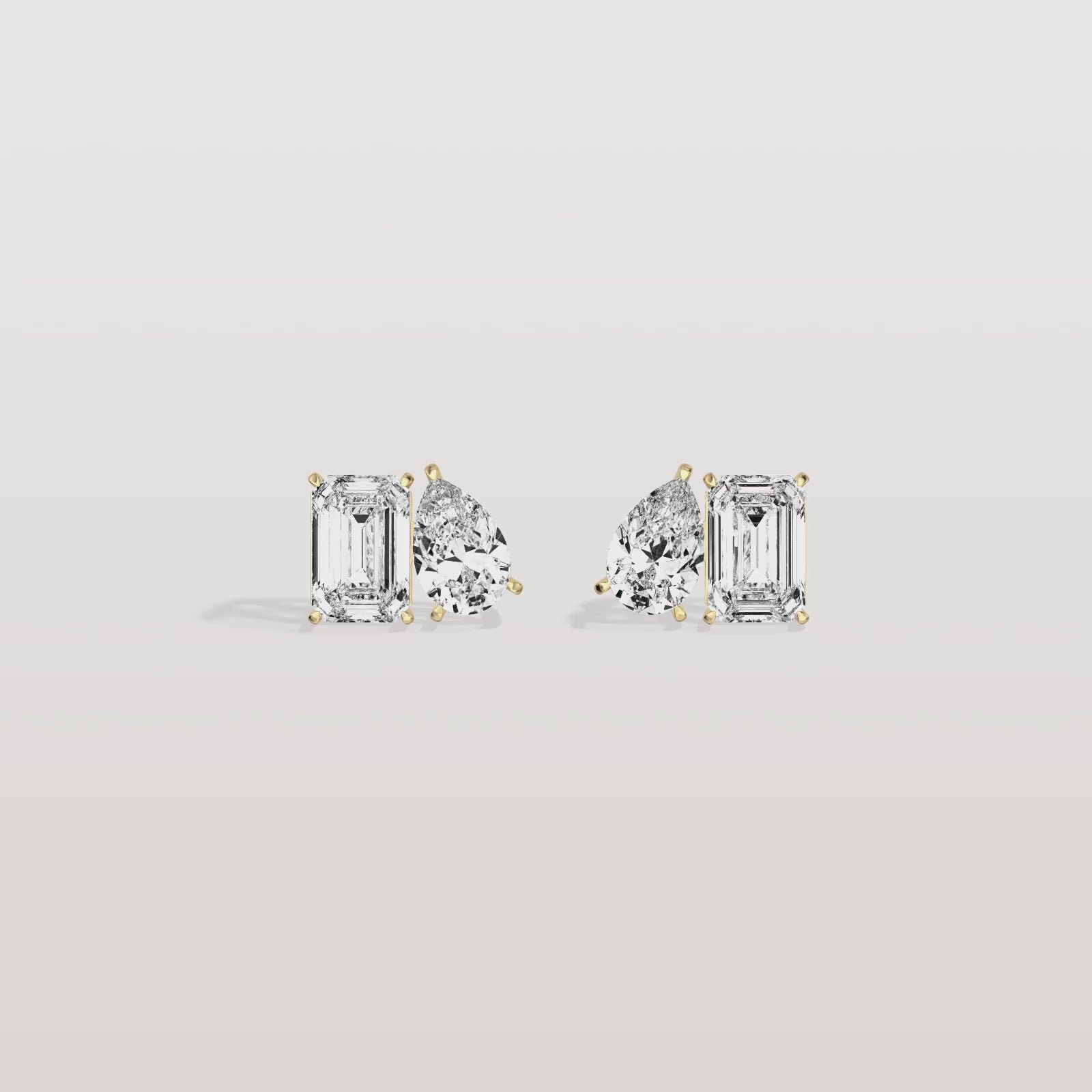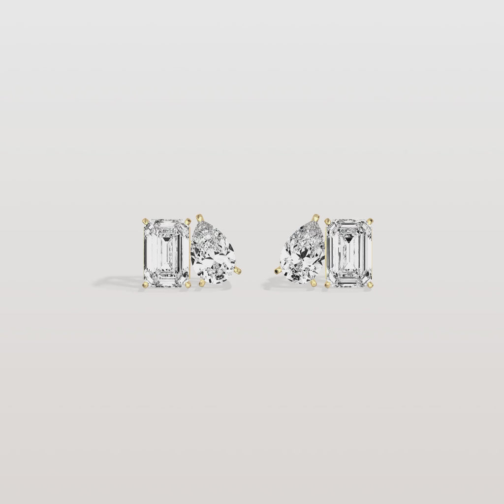 Capture the essence of modern elegance with these captivating stud earrings. Crafted in lustrous 14K Solid Gold/platinum, each earring showcases a dazzling pair of lab-grown diamonds: 2 classic emerald cut and 2 graceful pear cut, totaling 12 carats of brilliance. The unique arrangement of the stones, accented by delicate gold beading, creates a captivating interplay of shapes and light.