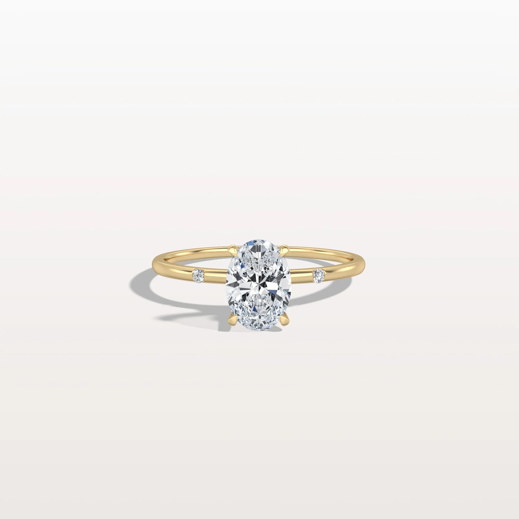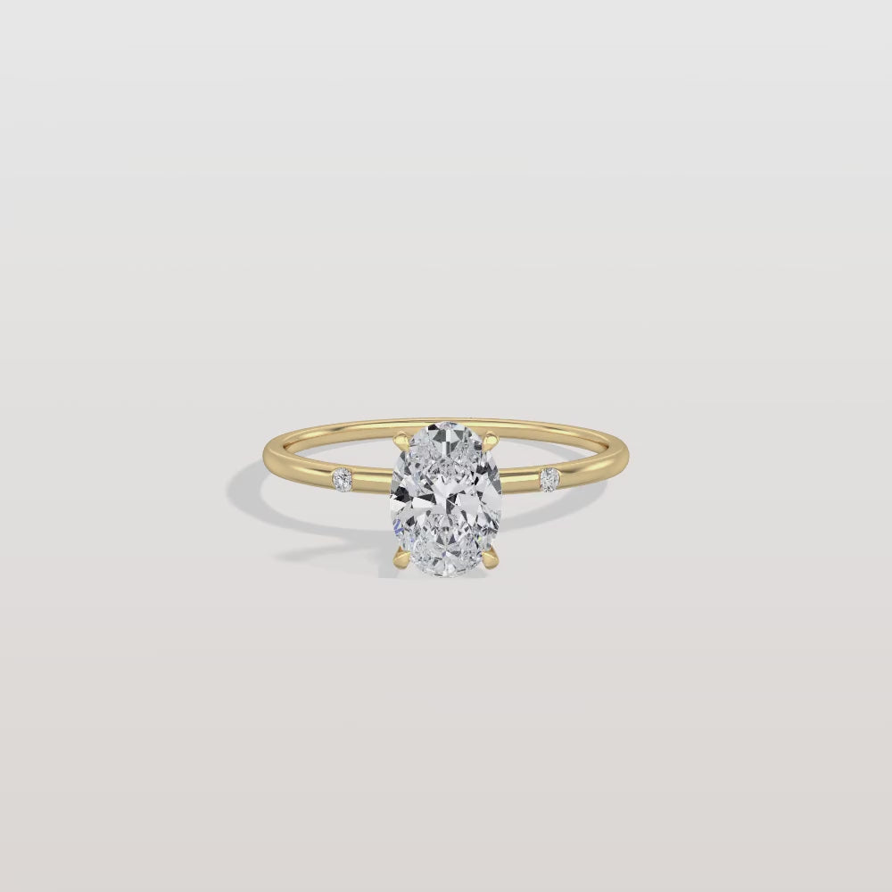 Let your love shine through with this dazzling oval cut lab diamond, perfectly embraced by shimmering side stones and a slender golden band. Crafted to make hearts skip a beat.