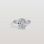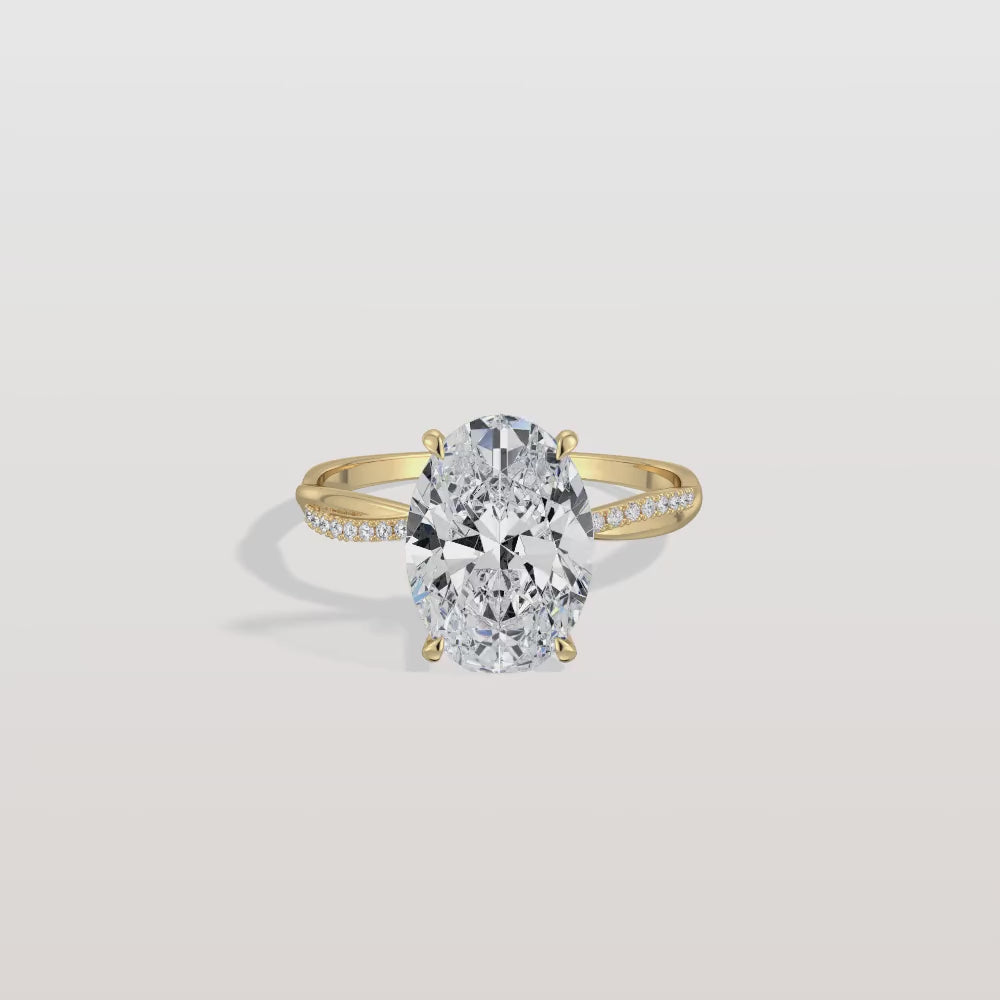 Gracefully set on a luminous solid gold/platinum, the brilliant oval center stone radiates endless sparkle, elongating the finger with its graceful silhouette. A delicate stream of pave lab diamonds adorns the band, representing every precious moment of your shared journey. This ring is not just a piece of jewelry-its a promise of love, devotion, and forever.