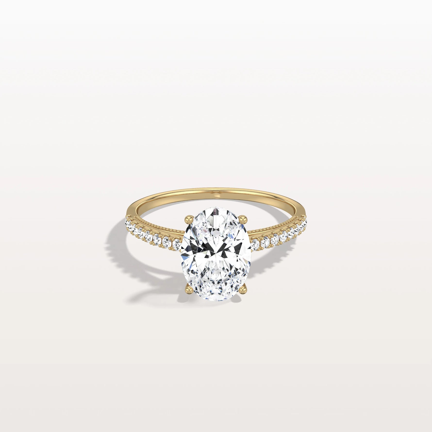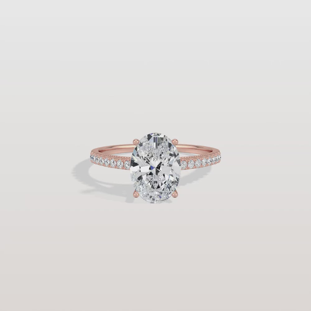 This exquisite engagement ring showcases an oval cut lab grown diamond, cradled by a cathedral setting and flanked by a shimmering pave band,designed to maximize brilliance and modern charm.