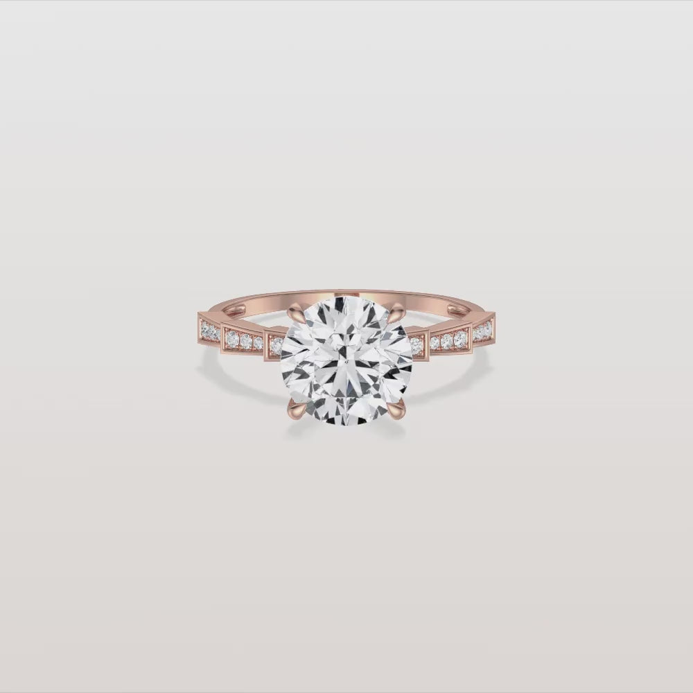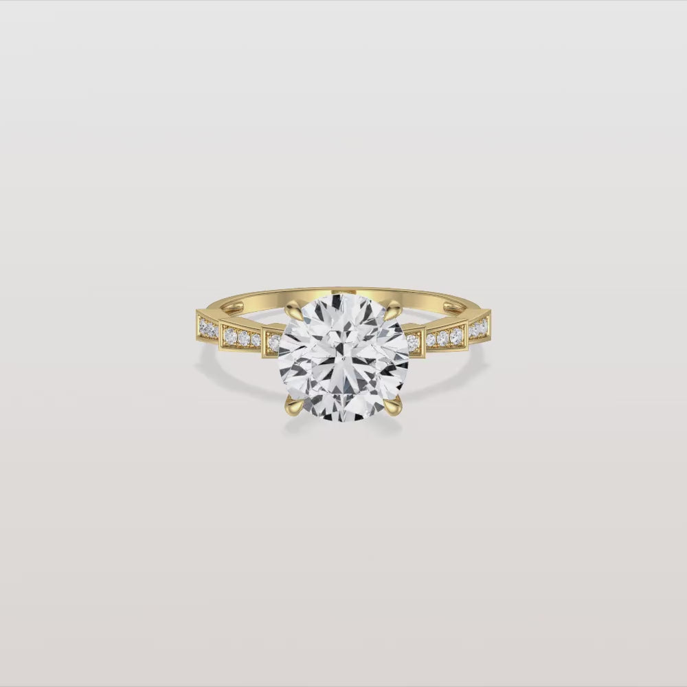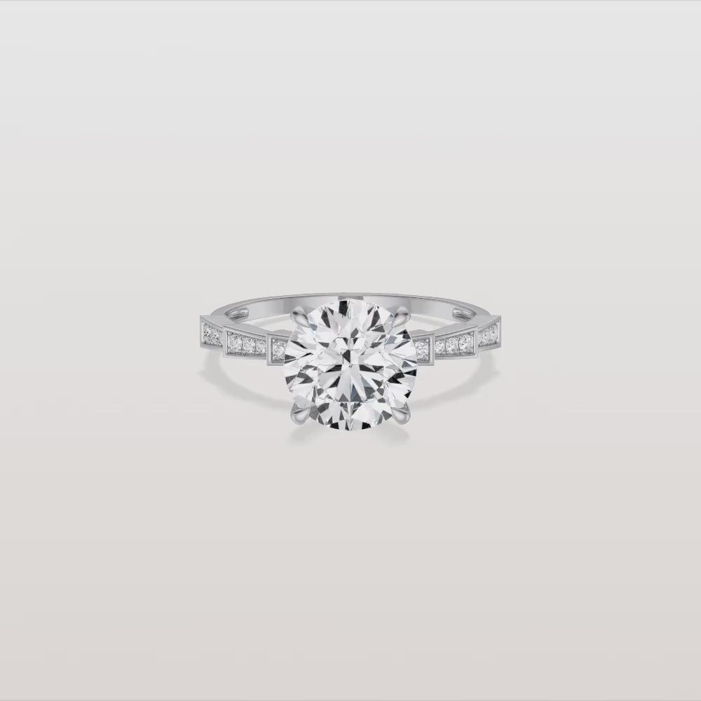 A bold yet refined solitaire fashion ring featuring a geometric pavé band in 14k gold and platinum. The segmented square settings add architectural elegance to the classic round center diamond.