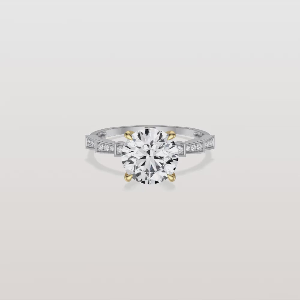 Unit price perA bold yet refined solitaire fashion ring featuring a geometric pavé band in 14k gold and platinum. The segmented square settings add architectural elegance to the classic round center diamond.