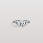 Four Baguette shaped side stones align to enhance the brilliance of the center created diamond in a statement-making setting that declares your love to the world.