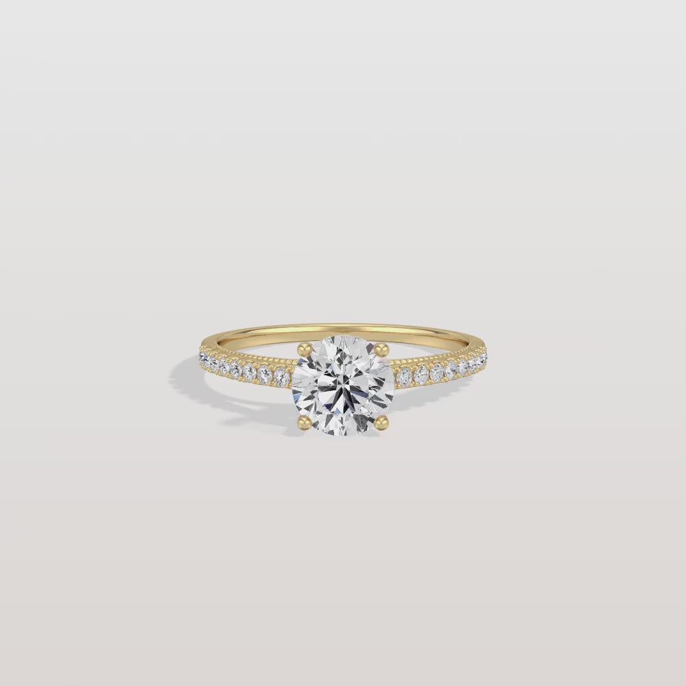 Unit price perIgnite your love story with this breathtaking 14k gold ring. A magnificent, round-cut gem, alive with fire, is held aloft in a delicate tulip-like embrace, secretly kissed by a halo of diamonds. The band, a river of shimmering pave lab grown diamonds, promises a lifetime of brilliance and romance.