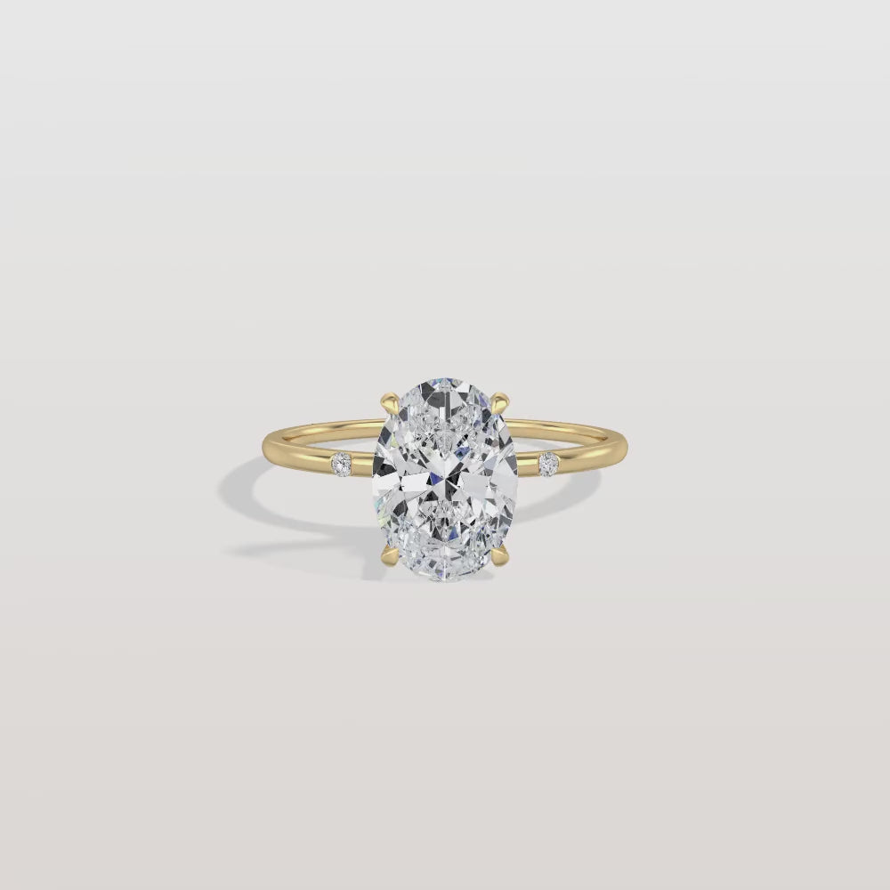 Unit price perLet your love shine through with this dazzling oval cut lab diamond, perfectly embraced by shimmering side stones and a slender golden band. Crafted to make hearts skip a beat.